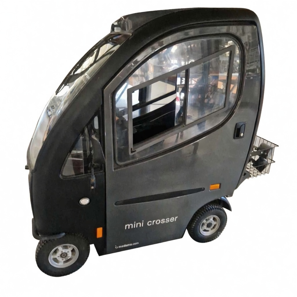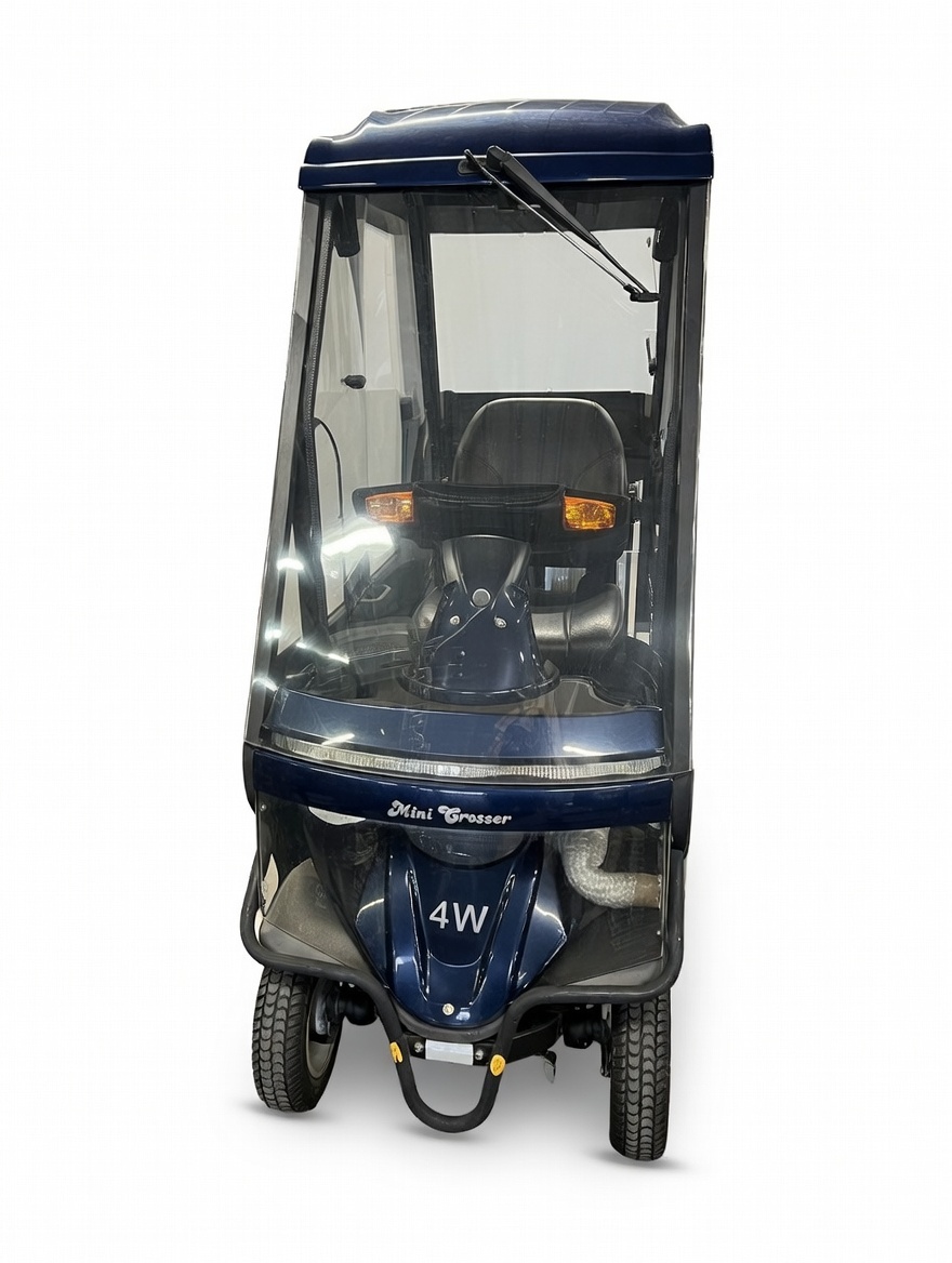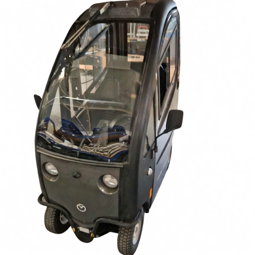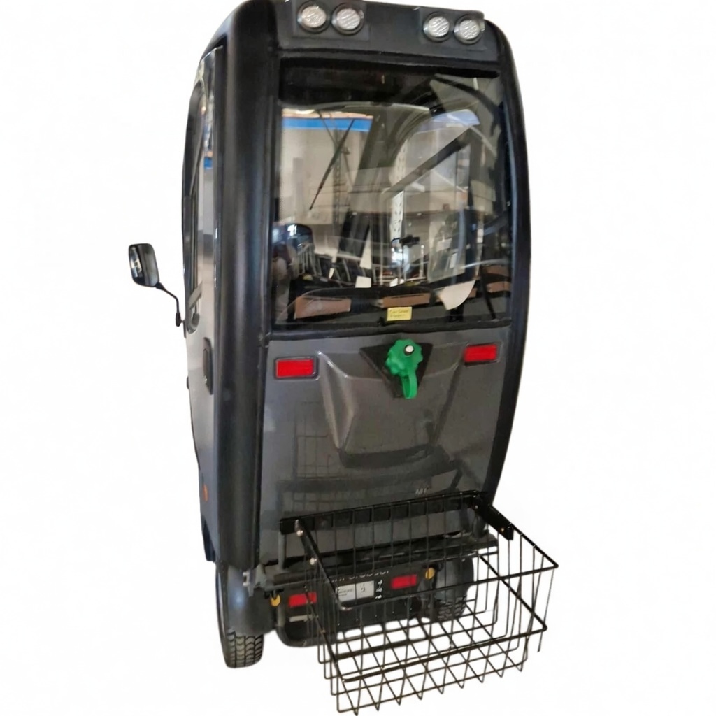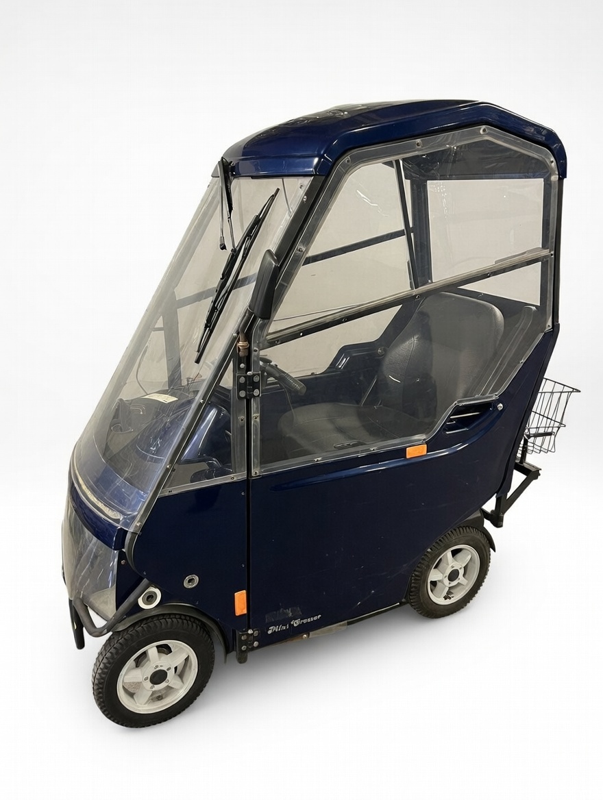 Az ilyen zárt kivitelű, úgynevezett „pápa mobilok” kényelmes és időjárás-védett közlekedést biztosítanak. Stabil, többkerekű kialakításuk biztonságos haladást tesz lehetővé, míg a burkolt felépítmény véd az esőtől és széltől. Tágas belső térrel, kényelmes üléssel és könnyű kezelhetőséggel rendelkeznek, így ideálisak bevásárláshoz, ügyintézéshez vagy mindennapi használatra. Elektromos meghajtásuk csendes és gazdaságos közlekedést biztosít.